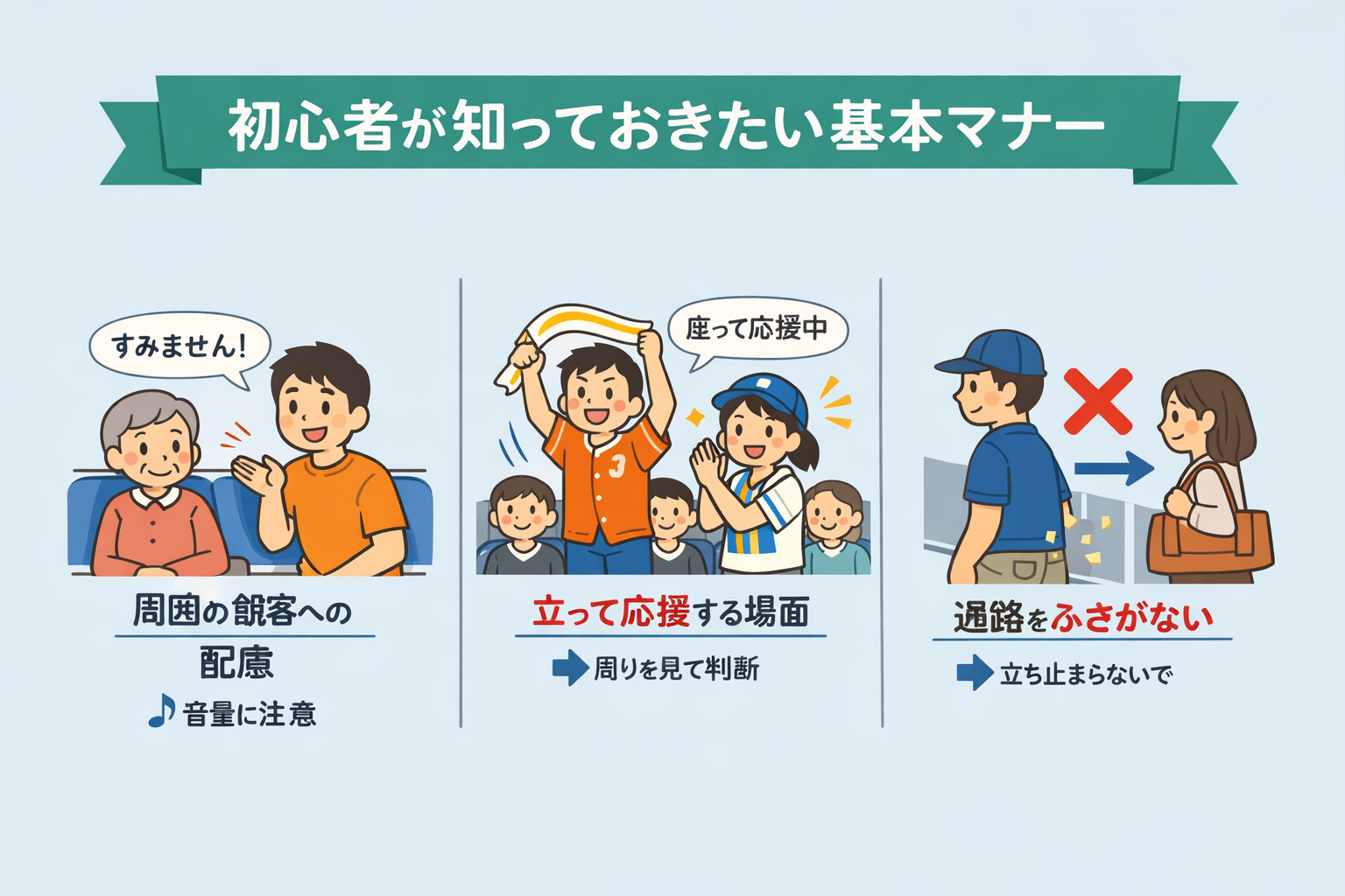 応援マナーは、完璧に覚えるものではなく、周りへの配慮を意識するものと考えるとわかりやすいです。