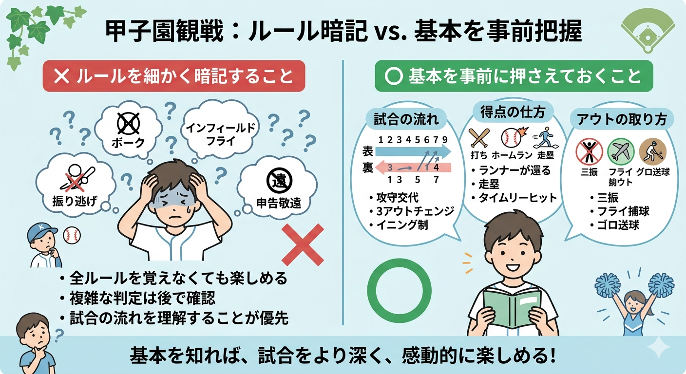 甲子園で高校野球を観戦するときに大切なのは、ルールを細かく暗記することよりも、事前に基本を押さえておくことです。