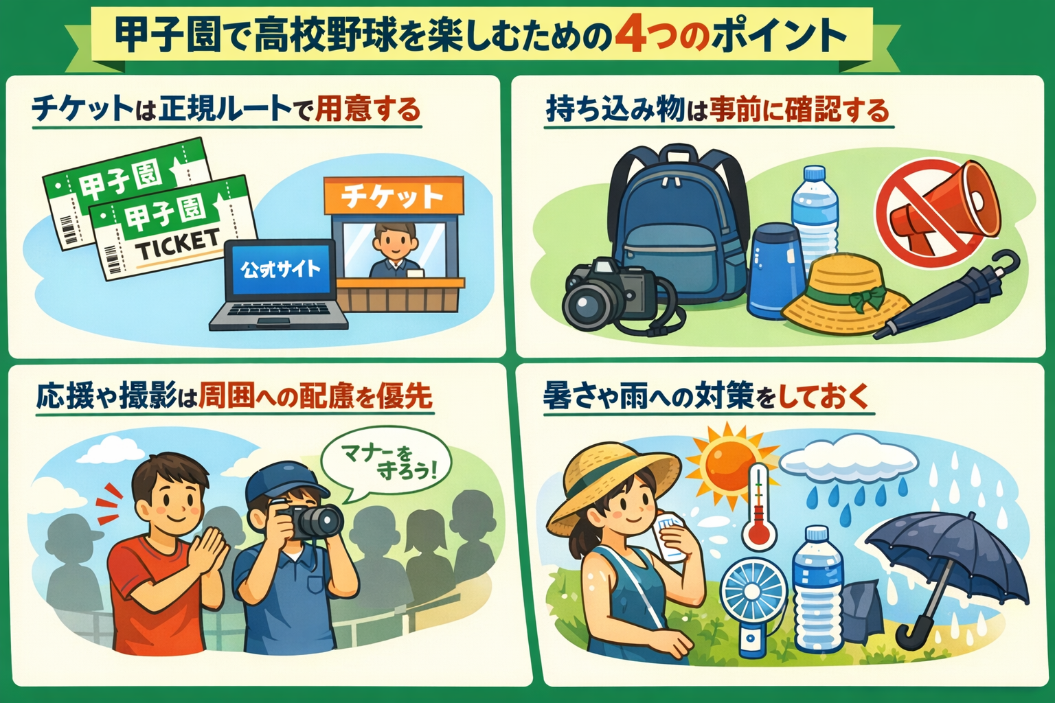 甲子園で高校野球を気持ちよく楽しむために、まず押さえておきたいのは次の4つです。