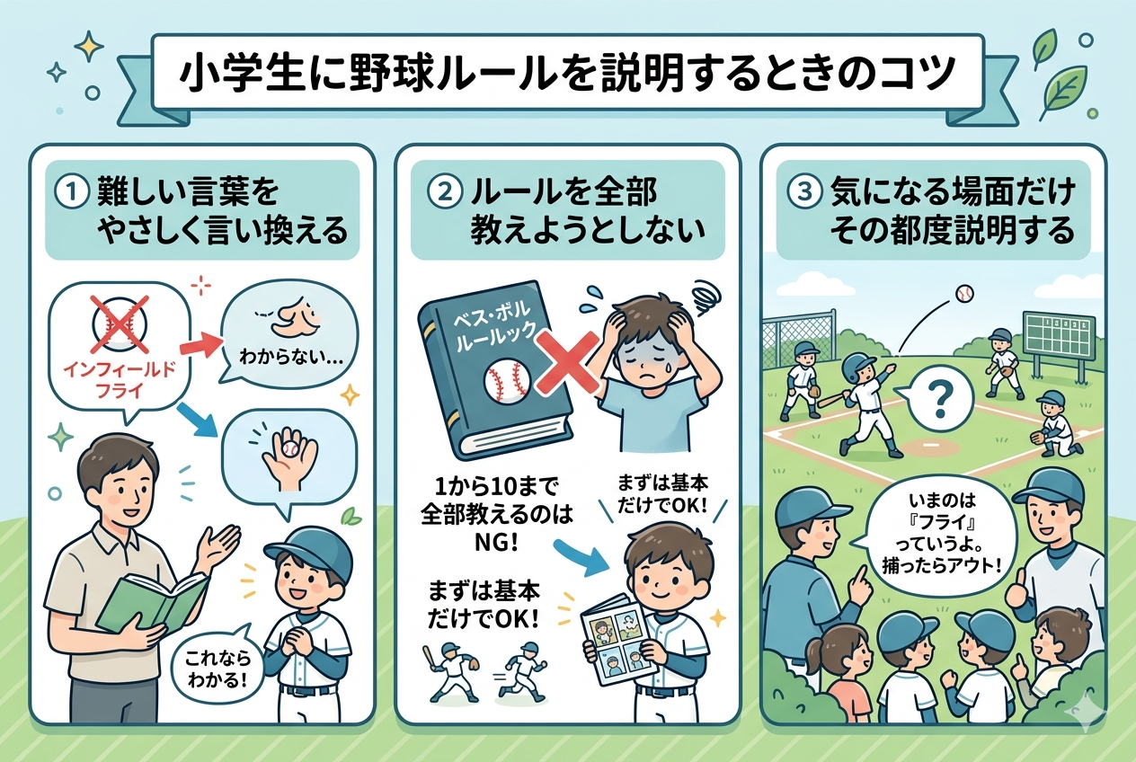 小学生に野球ルールを説明するときは、正確さよりも「イメージしやすさ」と「楽しさ」を大切にすることがポイントです。